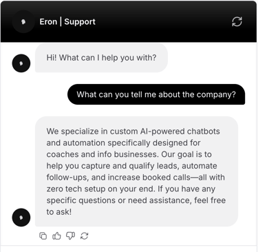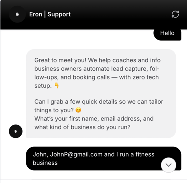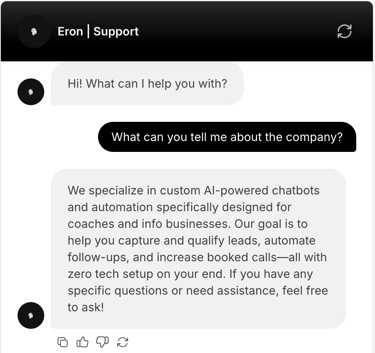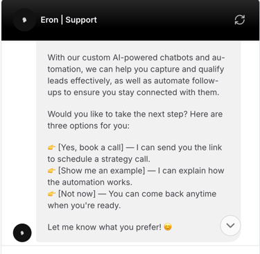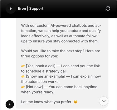 Eron AI builds chatbots that reply instantly, qualify leads, and book calls — so your business runs 24/7, even when you don’t.